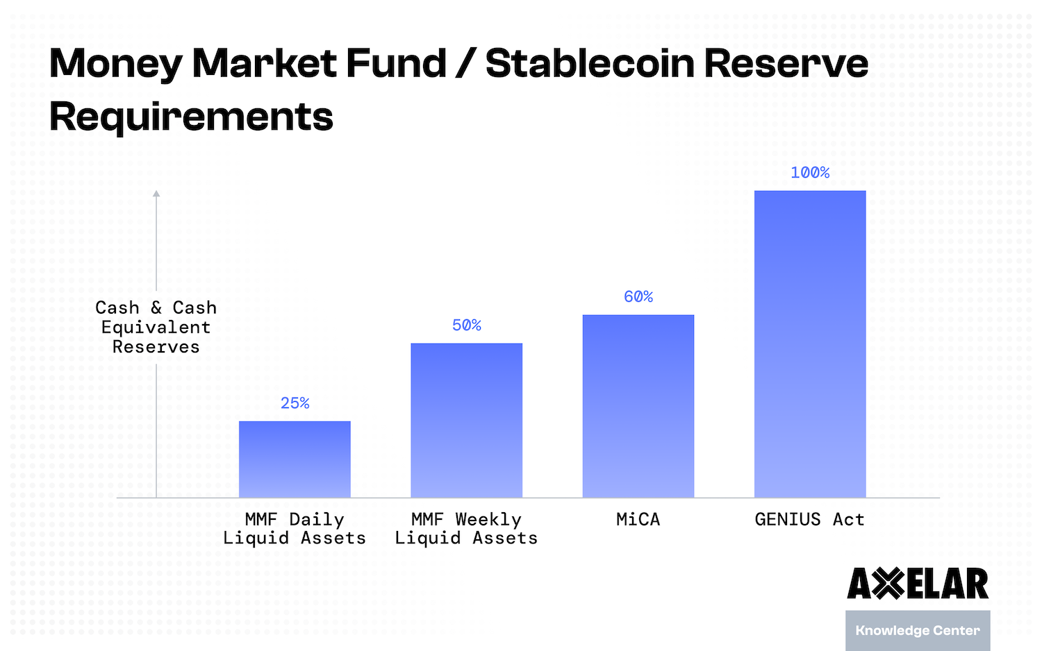 Additionally, in contrast to MMFs, which must keep 25% “daily liquid assets” and 50% “weekly liquid assets,” U.S. stablecoin issuers under the GENIUS Act will be required to hold 1:1 high-quality liquid reserves and provide monthly reserve disclosures.8 The law does not set MMF-style daily and weekly percentage buffers; rather it directs the primary regulators to develop additional liquidity rules. For context, EU’s Markets in Crypto-Assets (MiCA) regulation codifies short-term liquidity proportions of 30% of reserves as bank deposits for “non-significant asset-referenced tokens” and 60% for “significant asset-referenced tokens.”9
